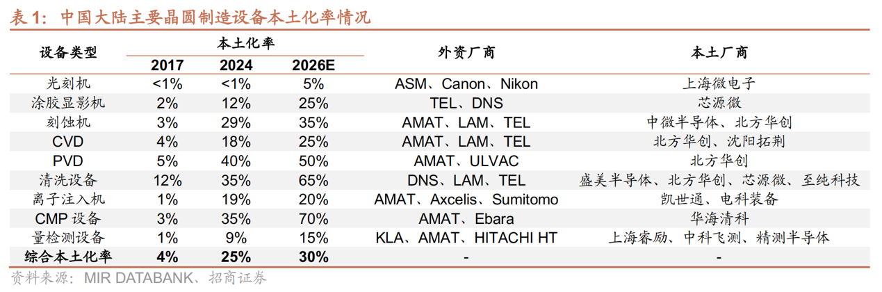 另一方面,自主可控导向下,国产半导体设备迎来广阔发展空间。根据 MIR,2024年中国晶圆制造设备综合本土化率 25%。分类来看,目前刻蚀、薄膜沉积、清洗、CMP设备的国产化率相对较高,光刻、涂胶显影、离子注入和量测设备则相对较低。MIR预计,到 2026年,中国晶圆制造设备综合本土化率有望提升至 30%。