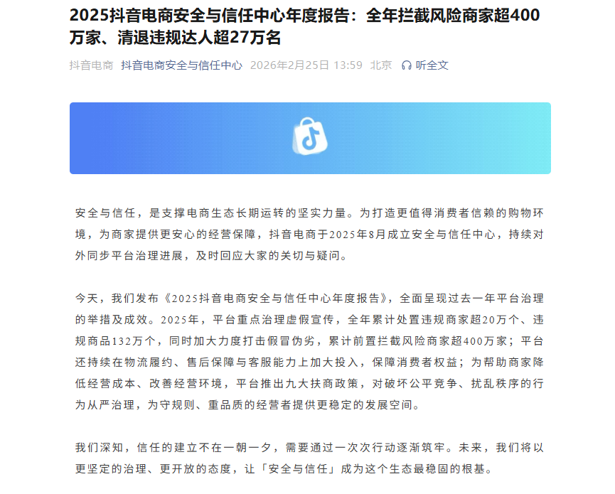 2月25日,抖音电商发布《2025抖音电商安全与信任中心年度报告》。报告显示,2025年,平台重点治理虚假宣传,全年累计处置违规商家超20万个、违规商品132万个,同时加大力度打击假冒伪劣,累计前置拦截风险商家超400万家。