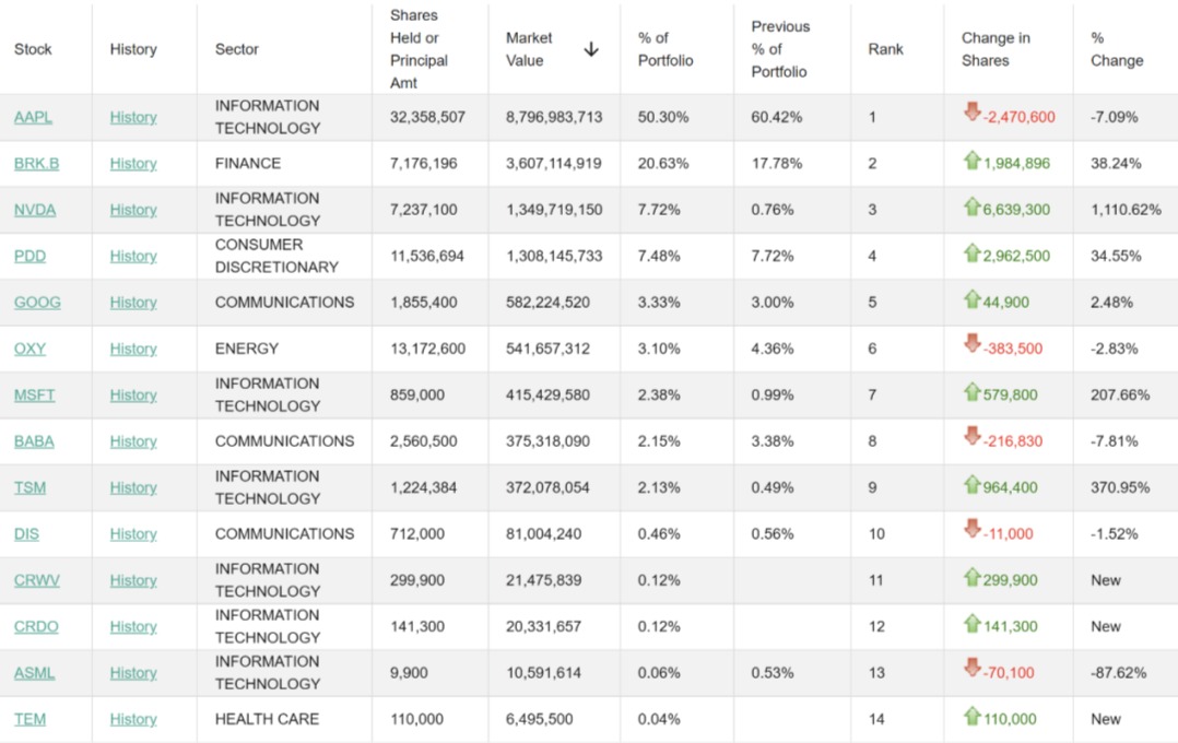 尽管增加对AI的关注,除了英伟达外,H&H的重仓股仍然多为传统行业公司,如头号重仓股苹果(AAPL.US),以及仓位占比较大的伯克希尔·哈撒韦、拼多多(PDD.US)、西方石油(OXY.US)等。段永平曾在谈及英伟达和AI相关产业时提到,“AI这个东西我觉得至少掺和一下,不要错过了。”
