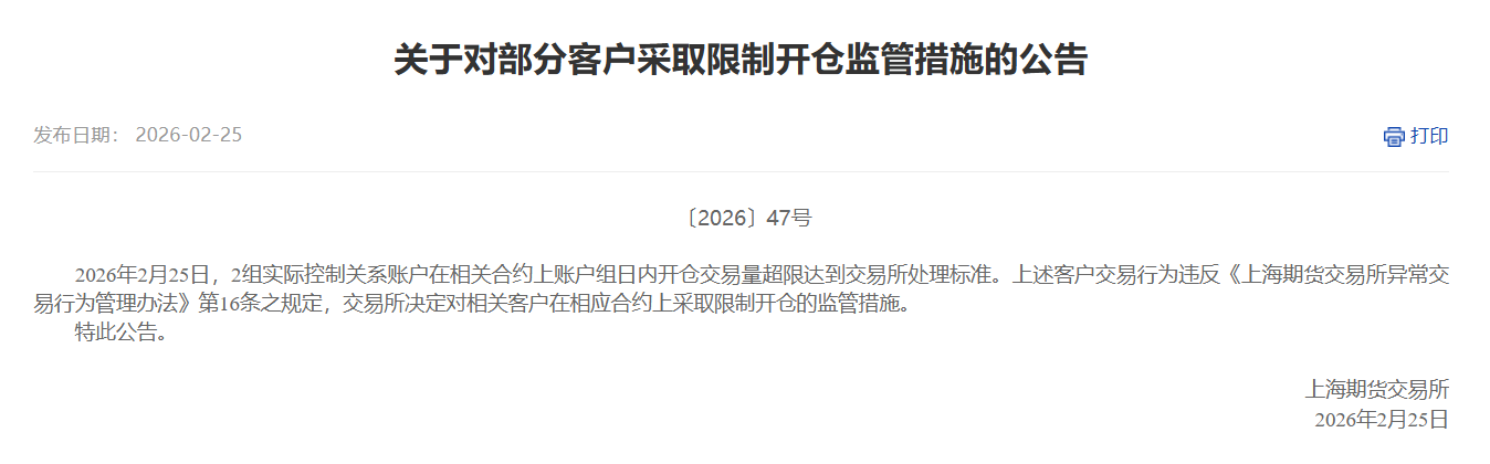 2月25日,上期所公告,2026年2月25日,2组实际控制关系账户在相关合约上账户组日内开仓交易量超限达到交易所处理标准。上述客户交易行为违反《上海期货交易所异常交易行为管理办法》第16条之规定,交易所决定对相关客户在相应合约上采取限制开仓的监管措施。