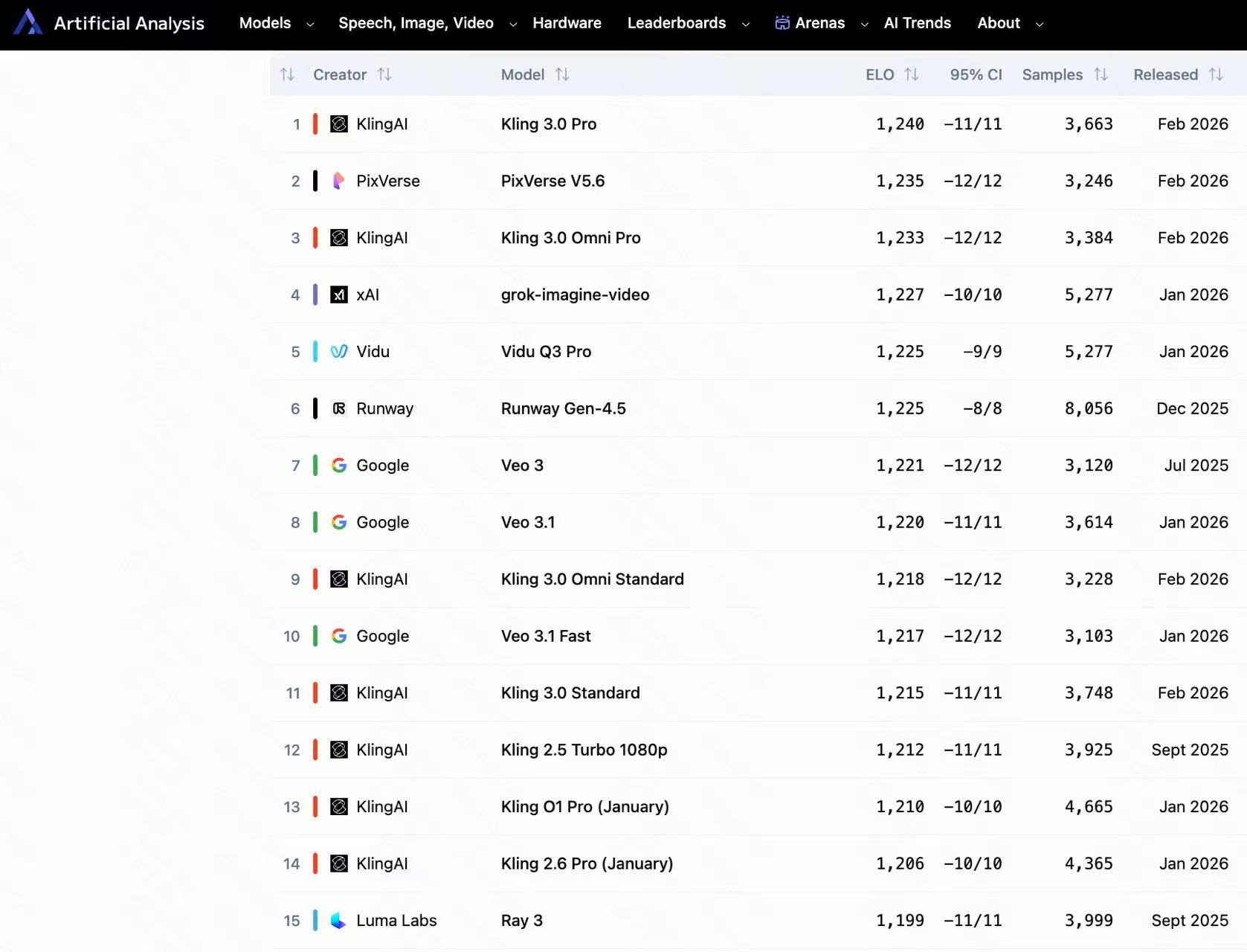 可灵3.0系列模型(Kling 3.0 Pro)以1240的Arena ELO基准测试评分位居文生视频赛道第一位,在前15名中可灵共有7个模型在榜。