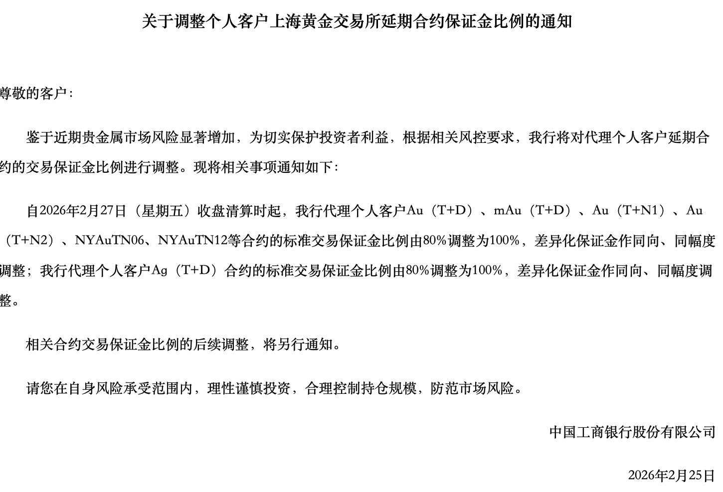 同日,工商银行亦宣布,自2026年2月27日(星期五)收盘清算时起,该行代理个人客户Au(T+D)、mAu(T+D)、Au(T+N1)、Au(T+N2)、NYAuTN06、NYAuTN12等合约的标准交易保证金比例由80%调整为100%,差异化保证金作同向、同幅度调整;该行代理个人客户Ag(T+D)合约的标准交易保证金比例由80%调整为100%,差异化保证金作同向、同幅度调整。