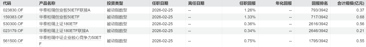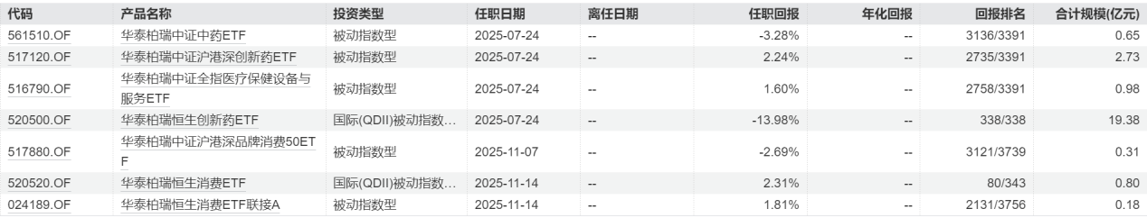无独有偶,华泰柏瑞基金在人才梯队建设上的布局早有先例。2025年7月24日,新人基金经理陈柯含履新首日,便从谭弘翔手中承接了中药ETF华泰柏瑞、创新药ETF华泰柏瑞及医疗ETF华泰柏瑞三只产品,并开始管理恒生创新药ETF,于2026年1月8日从李茜手中完全接过该基金的接力棒。