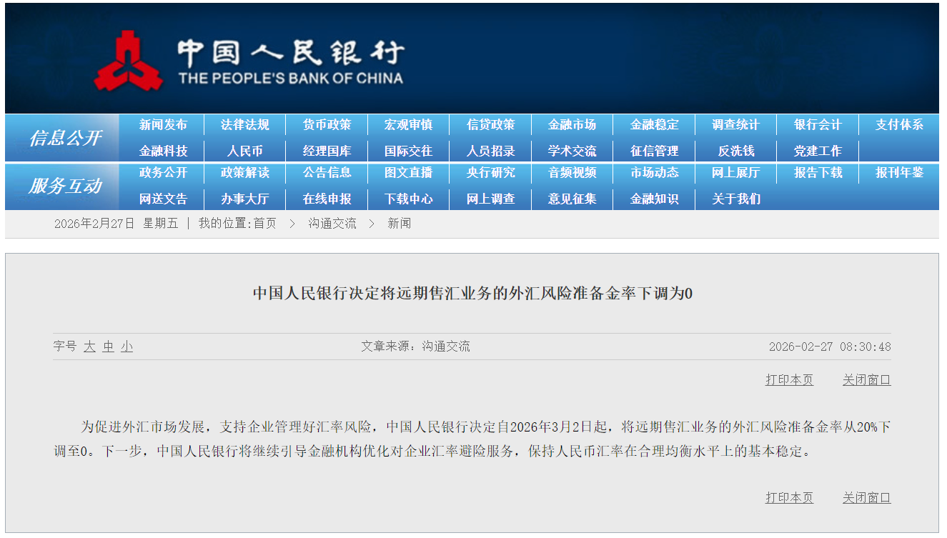 据中国人民银行官网2月27日消息,为促进外汇市场发展,支持企业管理好汇率风险,中国人民银行决定自2026年3月2日起,将远期售汇业务的外汇风险准备金率从20%下调至0。下一步,中国人民银行将继续引导金融机构优化对企业汇率避险服务,保持人民币汇率在合理均衡水平上的基本稳定。