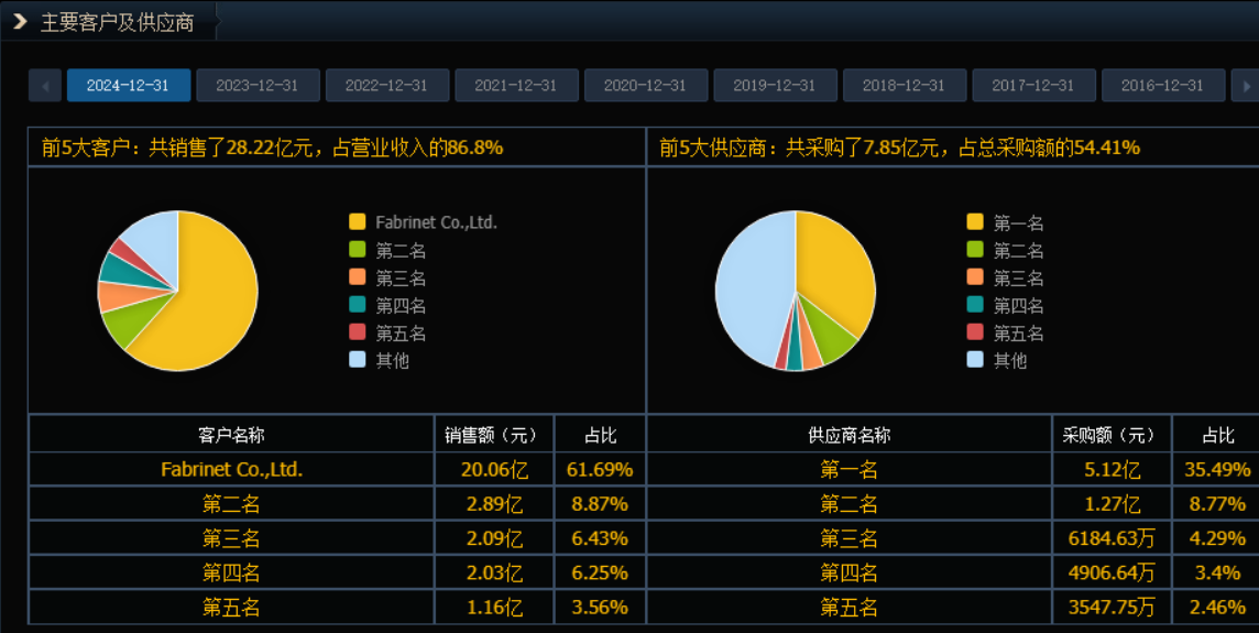 同花顺资料显示,在2024年,天孚通信的大客户即为Fabrinet,且占比高达61.69%。