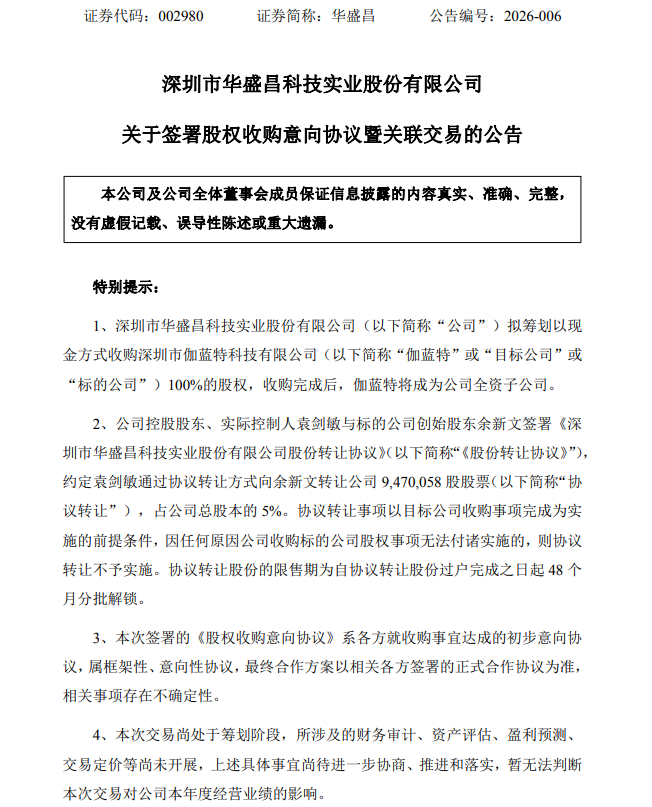 2月27日,华盛昌(002980.SZ)公告称,公司拟以现金方式收购深圳市伽蓝特科技有限公司100%股权,整体估值暂定为4.6亿元。同时,公司控股股东袁剑敏拟向伽蓝特创始股东余新文协议转让公司5%股份,协议转让事项以目标公司收购事项完成为实施的前提条件。伽蓝特专注于仪器仪表测试测量行业中的光通信模块和光芯片测试领域,本次股权收购为公司产业布局横向延伸。本次交易预计不构成重大资产重组。