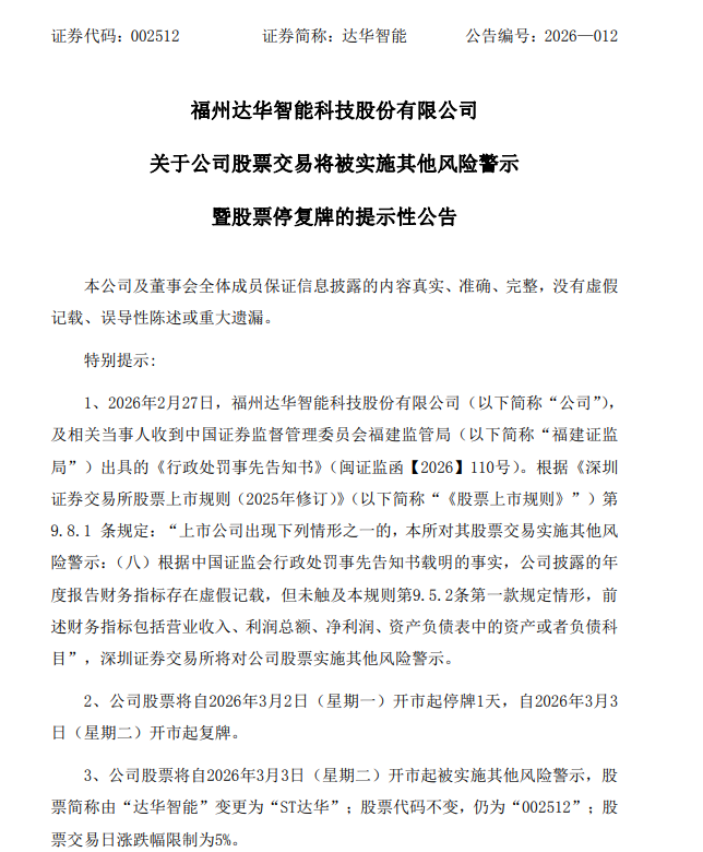 2月27日,达华智能(002512.SZ)公告称,因公司及相关当事人收到中国证券监督管理委员会福建监管局出具的《行政处罚事先告知书》,公司披露的2021年至2023年年度报告中存在重大遗漏,2023年年度报告存在虚假记载。根据相关规定,深圳证券交易所将对公司股票实施其他风险警示,股票简称由“达华智能”变更为“ST达华”,股票代码不变,仍为“002512”,股票交易的日涨跌幅限制由10%变为5%。公司股票将自2026年3月2日开市起停牌1天,自3月3日开市起复牌并实施其他风险警示。