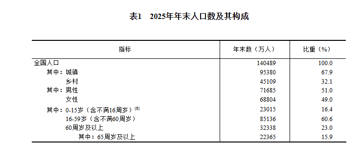 年末全国人口140489万人,比上年末减少339万人,其中城镇常住人口95380万人。全年出生人口792万人,出生率为5.63‰;死亡人口1131万人,死亡率为8.04‰;自然增长率为-2.41‰。