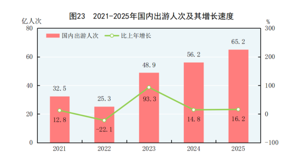 全年国内出游65.2亿人次,比上年增长16.2%。