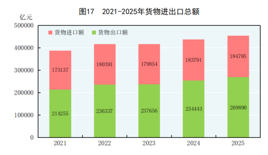 全年货物进出口总额454685亿元,比上年增长3.8%。其中,出口269890亿元,增长6.1%;进口184795亿元,增长0.5%。