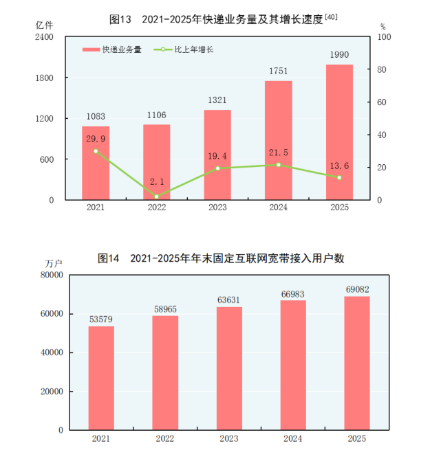 国家统计局:2025年完成邮政行业寄递业务总量2165亿件,比上年增长11.8%