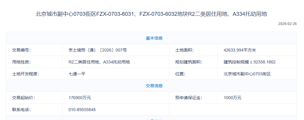 预申请信息显示,该宗地用地规模约4.26公顷,规划地上建筑面积约9.24万㎡,起拍价17.69亿元。预申请受理时间自2月26日起至3月27日下午17:00。