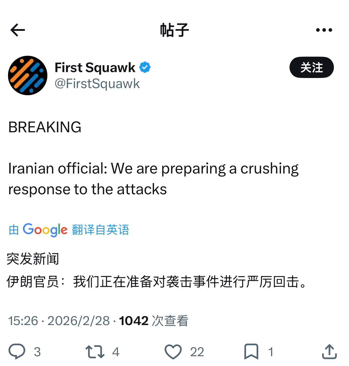 伊朗官员:正在准备对袭击事件进行严厉回击 财闻 2026-02-28 15:31:30 据外媒报道,伊朗官员称,我们正在准备对袭击事件进行严厉回击。 2月28日,据外媒报道,伊朗官员称,我们正在准备对袭击事件进行严厉回击。