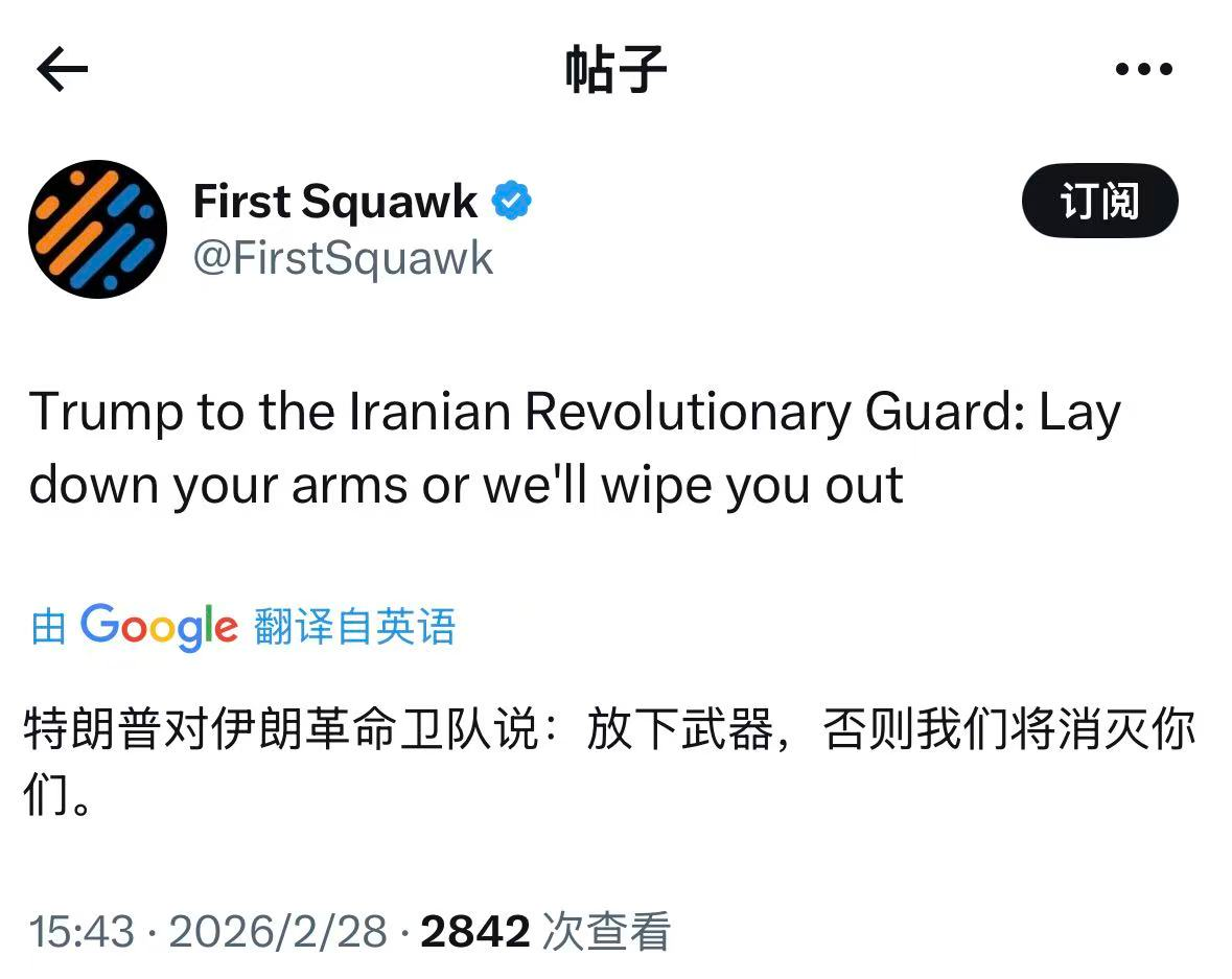 特朗普“喊话”伊朗革命卫队:放下武器,否则我们将消灭你们 财闻 2026-02-28 15:51:57 特朗普对伊朗革命卫队说,放下武器,否则我们将消灭你们。 据外媒2月28日报道,特朗普对伊朗革命卫队说,放下武器,否则我们将消灭你们。