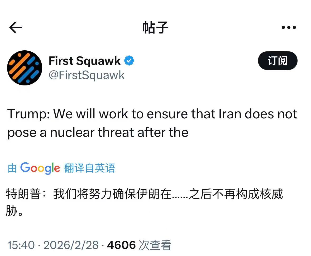 特朗普:我们将努力确保伊朗之后不再构成核威胁 财闻 2026-02-28 15:55:18 特朗普表示,我们将努力确保伊朗之后不再构成核威胁。 据外媒2月28日报道,特朗普表示,我们将努力确保伊朗之后不再构成核威胁。