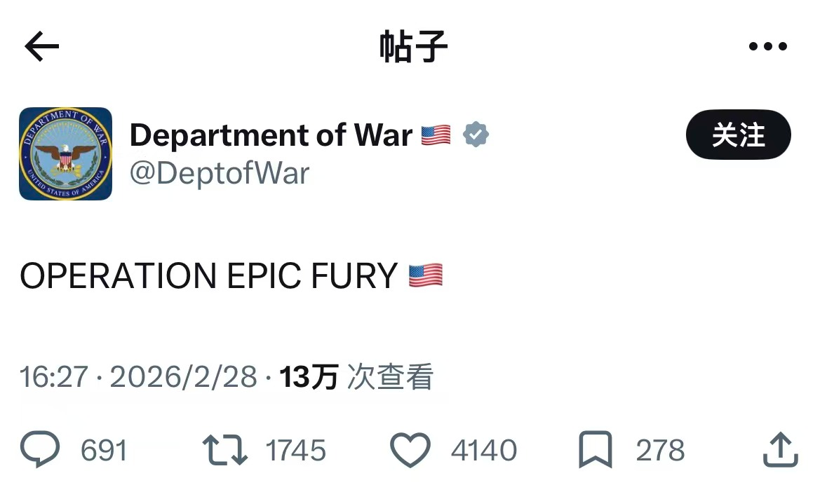 美国将此次对伊朗空袭行动命名为“史诗怒火” 财闻 2026-02-28 16:41:18 美国五角大楼28日表示,美国将此次对伊朗空袭行动命名为“史诗怒火”。 据央视新闻,美国五角大楼28日表示,美国将此次对伊朗空袭行动命名为“史诗怒火”。
