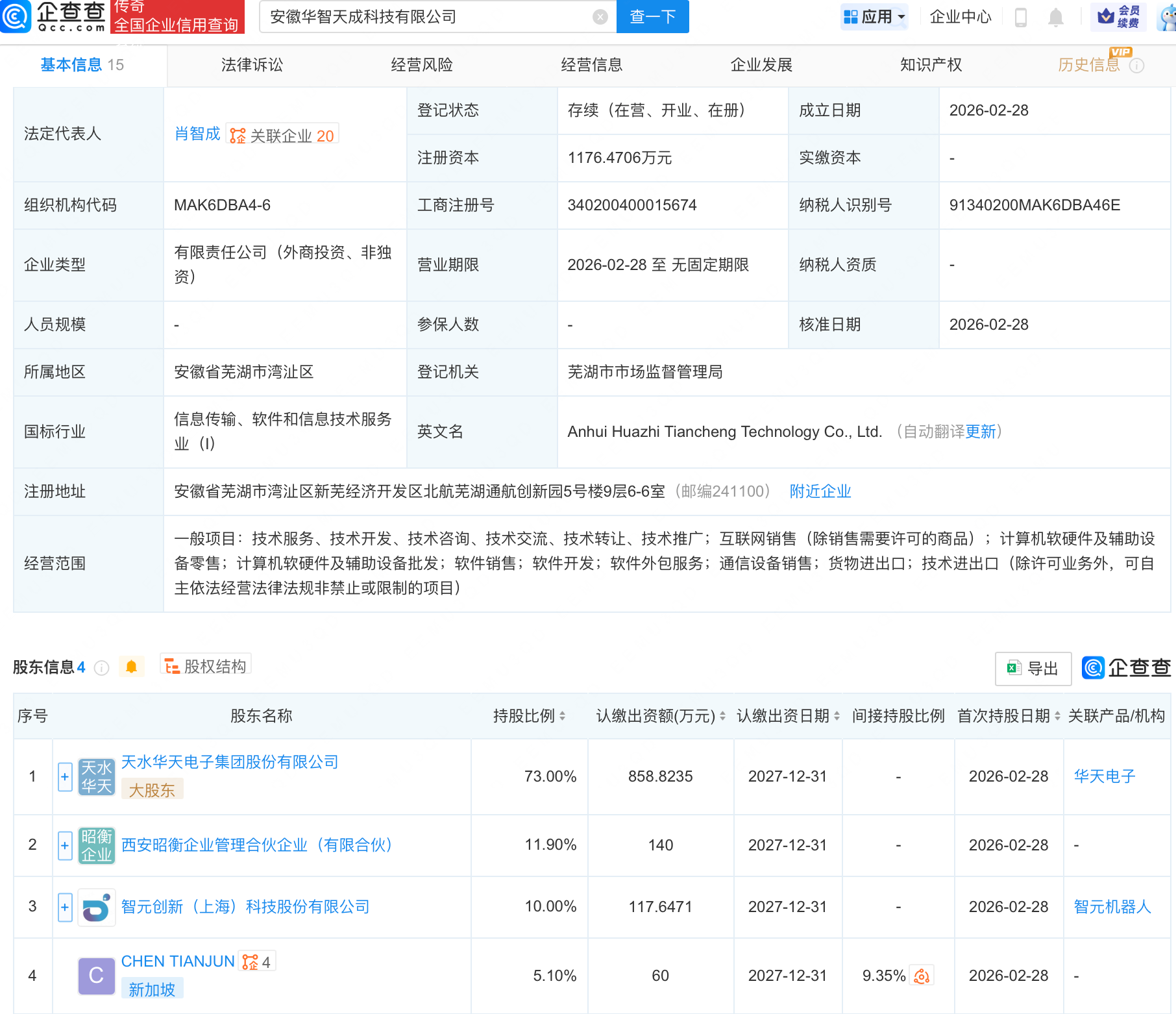 企查查APP显示,近日,安徽华智天成科技有限公司成立,法定代表人为肖智成,经营范围包含:计算机软硬件及辅助设备零售;计算机软硬件及辅助设备批发;软件销售;通信设备销售等。企查查股权穿透显示,该公司由智元机器人关联公司智元创新(上海)科技股份有限公司、天水华天电子集团股份有限公司等共同持股。