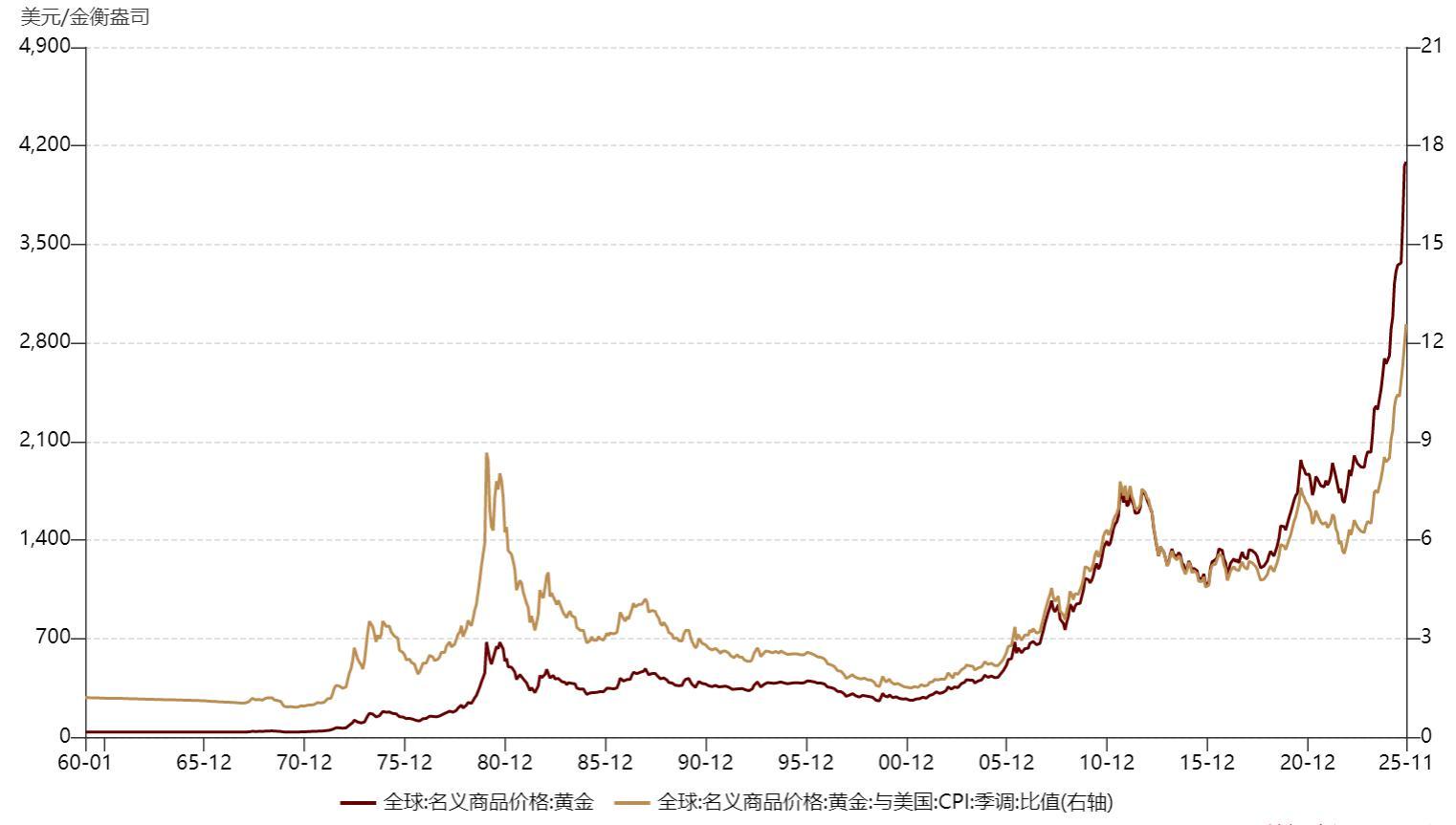 黄金 / CPI反应黄金和物价的相对涨幅,当该指标趋于高位时,反应黄金或被通胀高估。