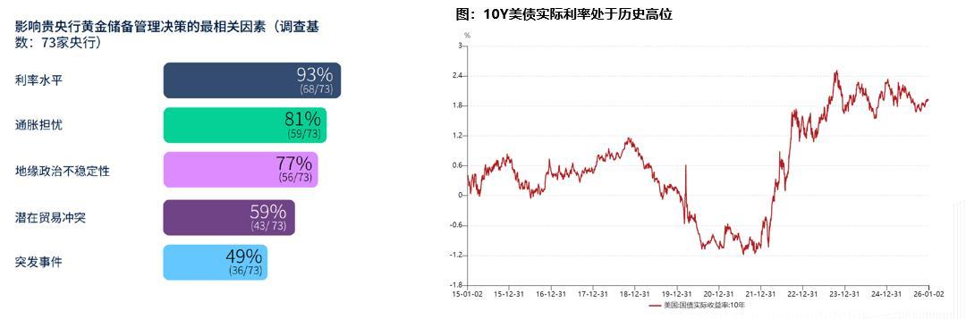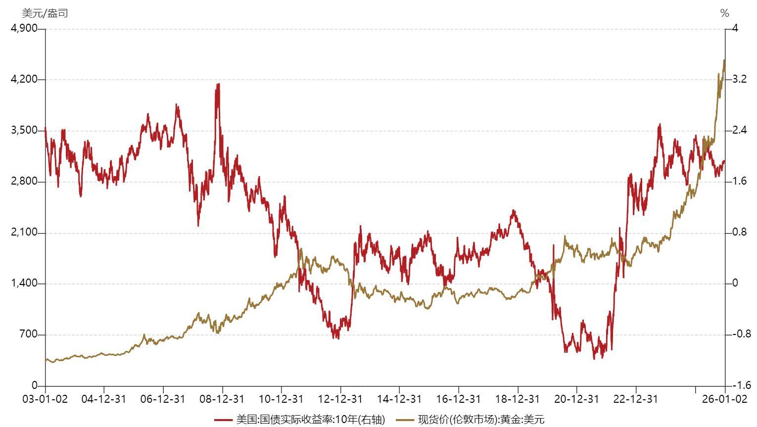 核心逻辑已由“实际利率”转向“信用重构”:传统逻辑下黄金与实际利率(美债实际收益率)呈强负相关,但当前定价权正向“避险 + 去美元化” 倾斜。