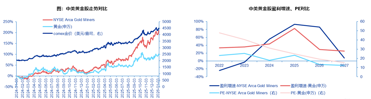 3、黄金股ETF(159562)跟踪中证沪深港黄金产业股票指数,因金矿开采成本刚性,金价上涨带动利润增长,叠加金矿公司产量扩张,业绩增速远超金价涨幅,因此黄金股弹性显著高于金价。2025年4月前,中美黄金股走势基本相近,此后美股涨幅大于A股。相较美股黄金股,A股黄金股仍有上涨空间。