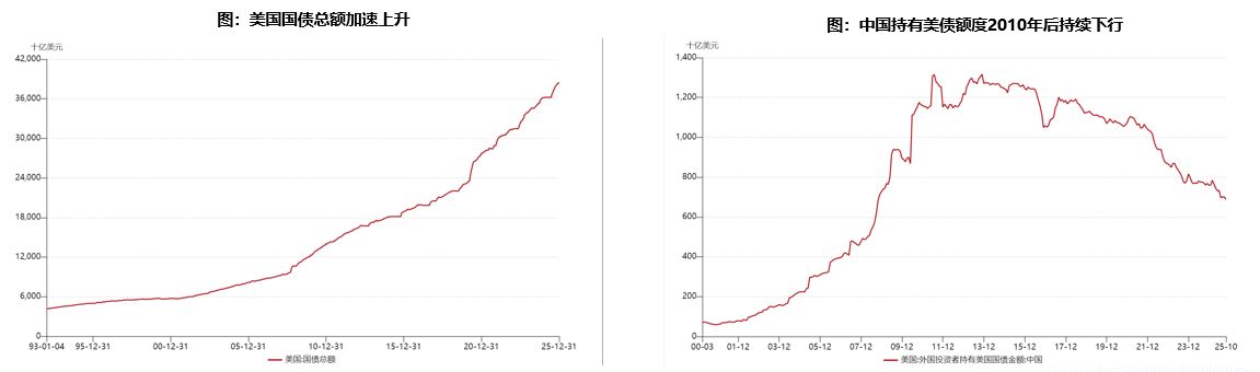 美国国债总额加速上升,明年或破40万亿大关:美国国债总额呈加速上升态势,上一轮2012年末黄金大牛市美国国债总额为16.4万亿美元。而本轮美国国债已超38万亿,且国债总额呈加速上升趋势,仅今年美国国债总额增加近2万亿,以目前增长速度外推,2026年末美国国债规模或破40万亿大关。下行的美元信用利好金价上涨。