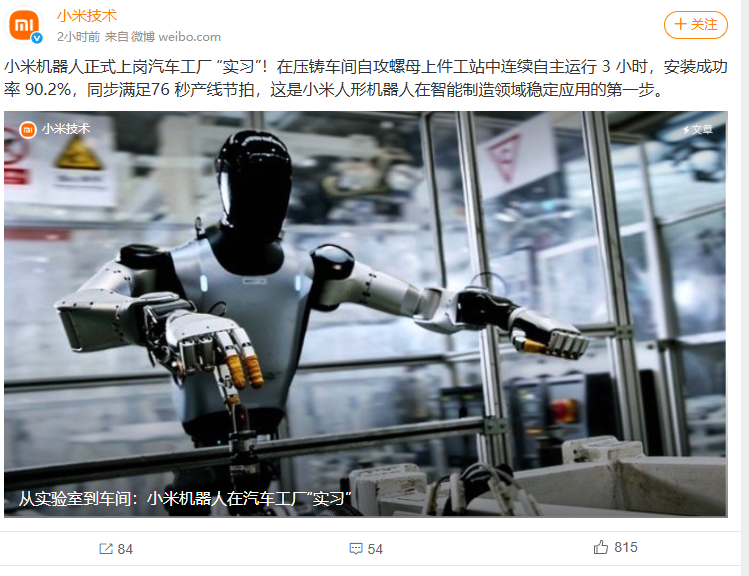 据小米技术官方微博3月2日消息,小米机器人正式上岗汽车工厂“实习”,在压铸车间自攻螺母上件工站中连续自主运行3小时,双侧同时安装成功率90.2%,同时满足最快76秒产线节拍。小米表示,这是小米人形机器人迈出在汽车制造场景规模化应用的第一步。