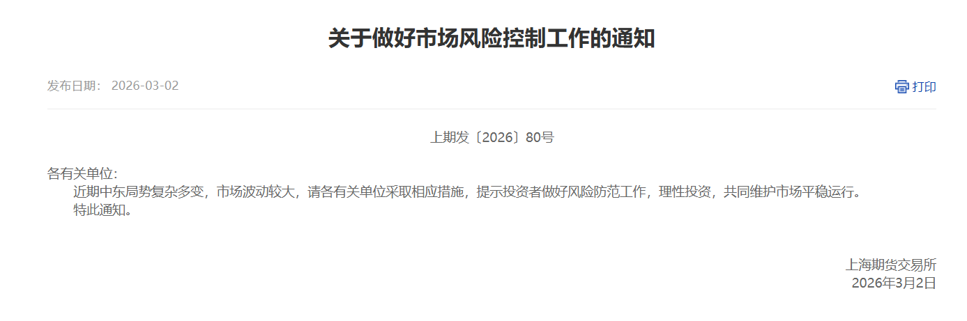 3月2日,上期所公告,近期中东局势复杂多变,市场波动较大,请各有关单位采取相应措施,提示投资者做好风险防范工作,理性投资,共同维护市场平稳运行。