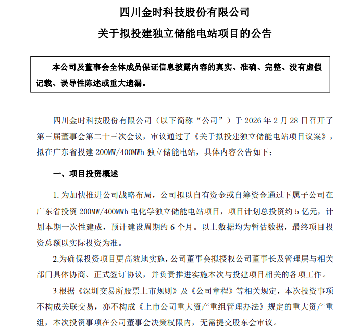 3月2日,金时科技(002951.SZ)公告,公司于2026年2月28日召开第三届董事会第二十三次会议,审议通过了《关于拟投建独立储能电站项目议案》。公司拟使用自有资金或自筹资金通过下属子公司在广东省投资200MW/400MWh电化学独立储能电站项目,预计总投资约5亿元,计划本期一次性建成,预计建设周期约6个月。以上数据均为暂估数据,最终项目投资总额以实际投资为准。