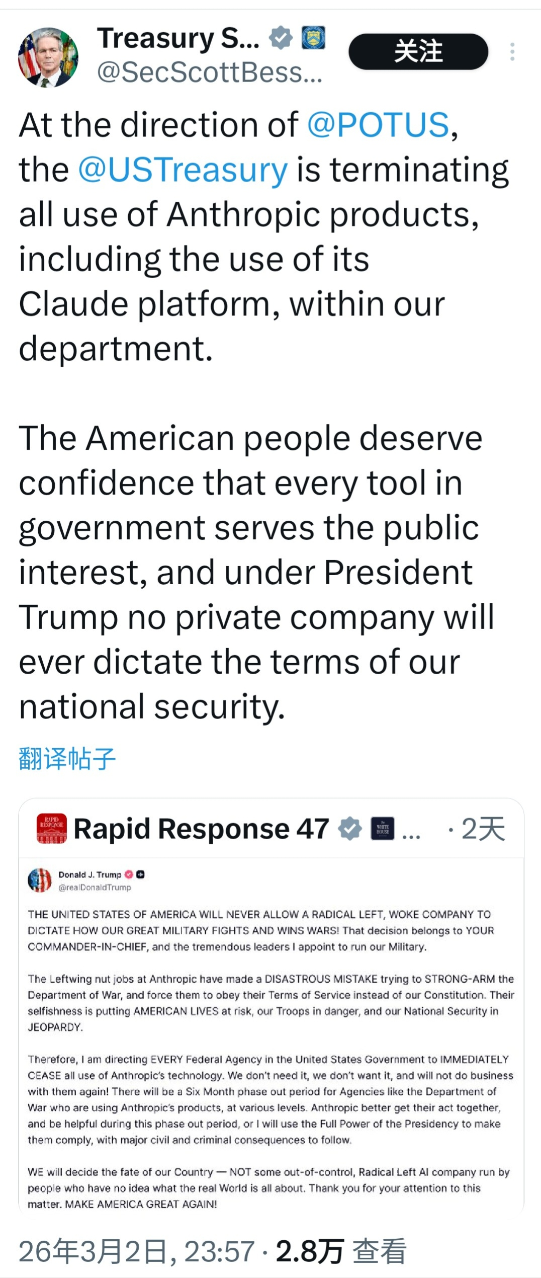 3月2日晚,美国财政部长贝森特发文称,根据 @POTUS 的指示,@USTreasury 部门将终止所有对Anthropic产品的使用,包括对其Claude平台的使用。