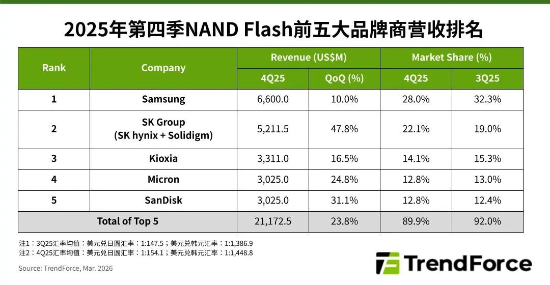 机构:AI服务器存储需求暴增,2025年Q4 NAND Flash前五大品牌厂营收合计大幅季增23.8%