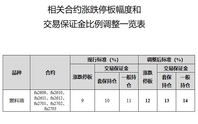 上期所:调整燃料油期货相关合约涨跌停板幅度和交易保证金比例