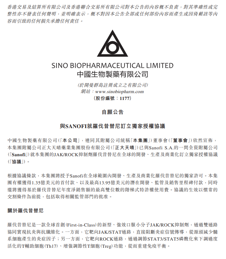 3月4日,中国生物制药(01177.HK)公告,公司附属公司正大天晴药业集团股份有限公司与赛诺菲全资附属公司就JAK/ROCK抑制剂罗伐昔替尼(商品名:安煦 )在全球范围内的开发、生产及商业化订立独家授权协议。公司获1.35亿美元首付款、最高13.95亿美元里程碑付款,并享有基于年度净销售额的最高双位数阶梯式特许权使用费。