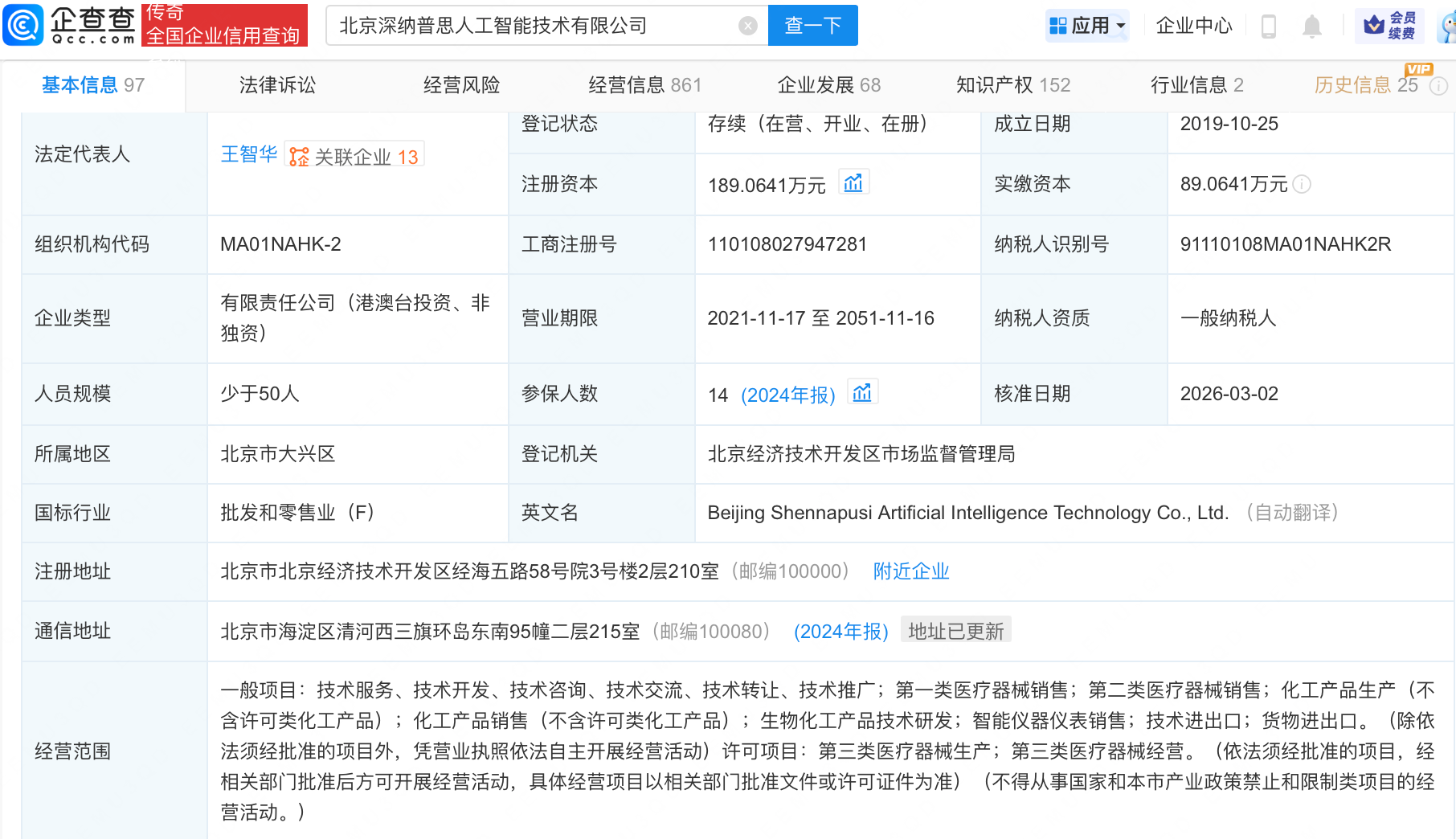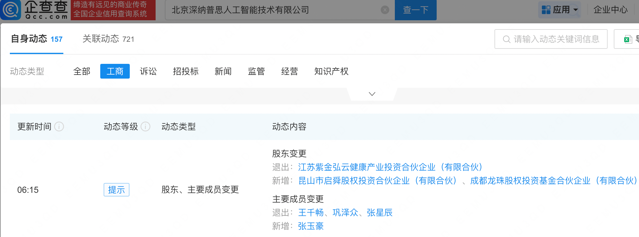 企查查APP显示,近日,北京深纳普思人工智能技术有限公司发生工商变更,新增美团旗下成都龙珠股权投资基金合伙企业(有限合伙)等为股东。企查查信息显示,该公司成立于2019年,经营范围包含:生物化工产品技术研发;智能仪器仪表销售;第三类医疗器械生产;第三类医疗器械经营等。据其官网,深纳普思专注于AI赋能生物传感器研发。