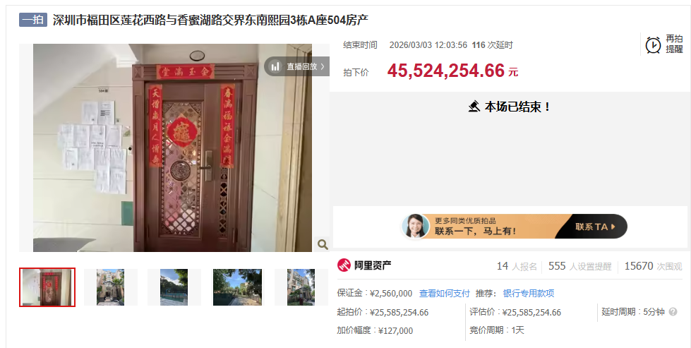 日前,深圳市福田区莲花西路与香蜜湖路交界东南熙园3栋A座504房产在阿里拍卖平台成功拍卖,经过119轮竞拍,最终以约4552万元成交,溢价率超80%。