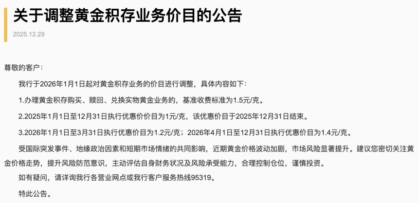 江苏银行2025年12月公告称,2026年1月1日起对黄金积存业务价目进行调整,2026年1月1日至3月31日执行优惠价目为1.2元/克;2026年4月1日至12月31日执行优惠价目为1.4元/克。黄金积存手续费已包含在手机银行App所显示的金价之中,客户无需另行支付。