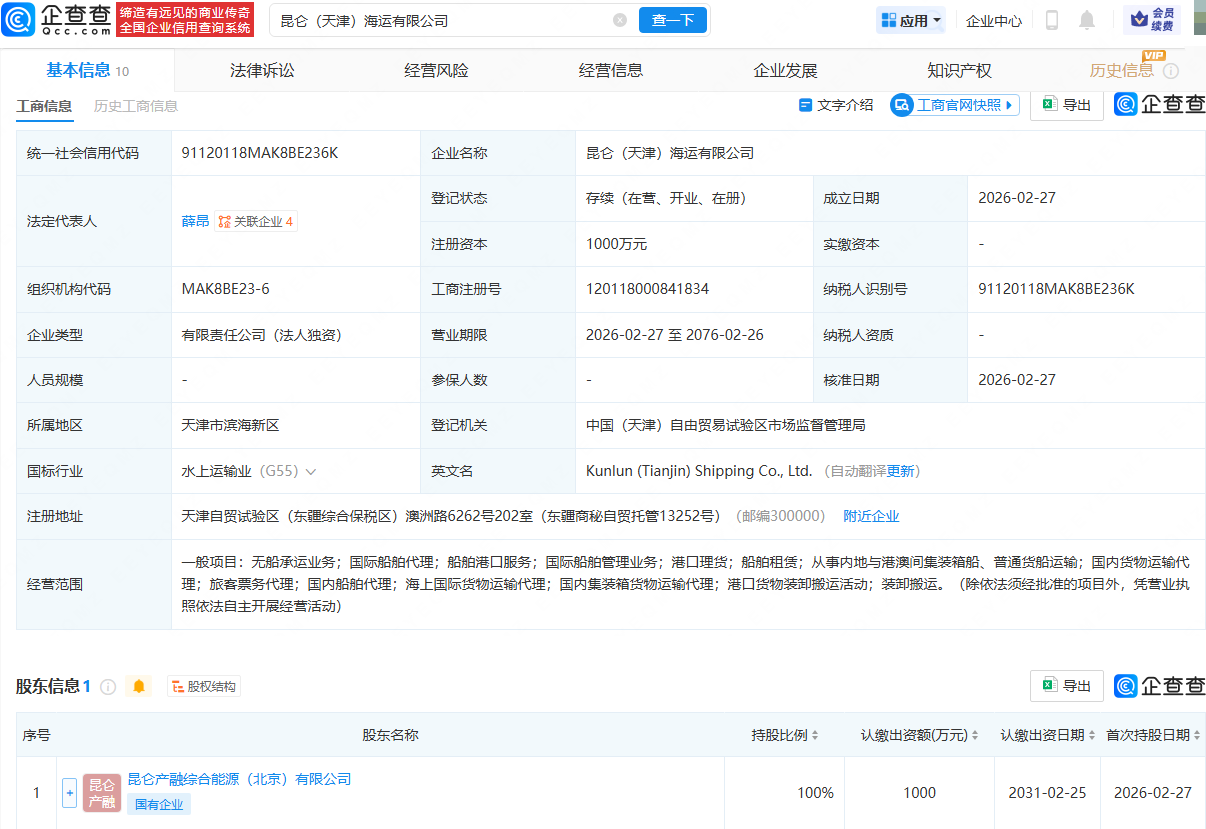 企查查APP显示,近日,昆仑(天津)海运有限公司成立,法定代表人为薛昂,注册资本为1000万人民币,经营范围包含:无船承运业务;国际船舶代理;船舶港口服务;国际船舶管理业务;港口理货;船舶租赁等。企查查股权穿透显示,该公司由中油资本(000617.SZ)旗下昆仑产融综合能源(北京)有限公司全资持股。