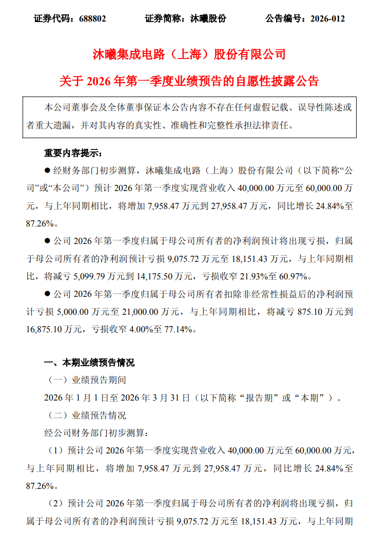 沐曦股份:预计2026年Q1净亏损9076万元~1.82亿元,亏损同比收窄21.93%~60.97%