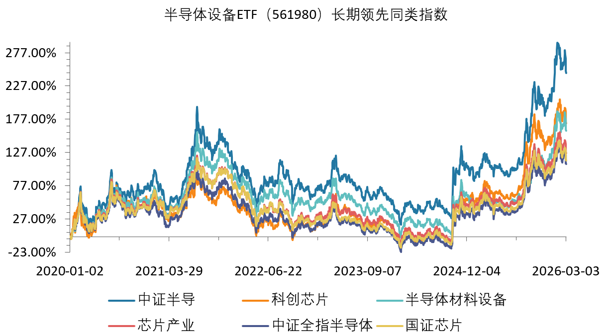 数据显示,截至3月4日,该指数自2020年、2025年至今分别上涨261%、77%,在科创芯片、半导体材料设备等同类指数中均位列第一,高弹性特征显著,或在新一轮半导体上行周期中更具反弹锐度。