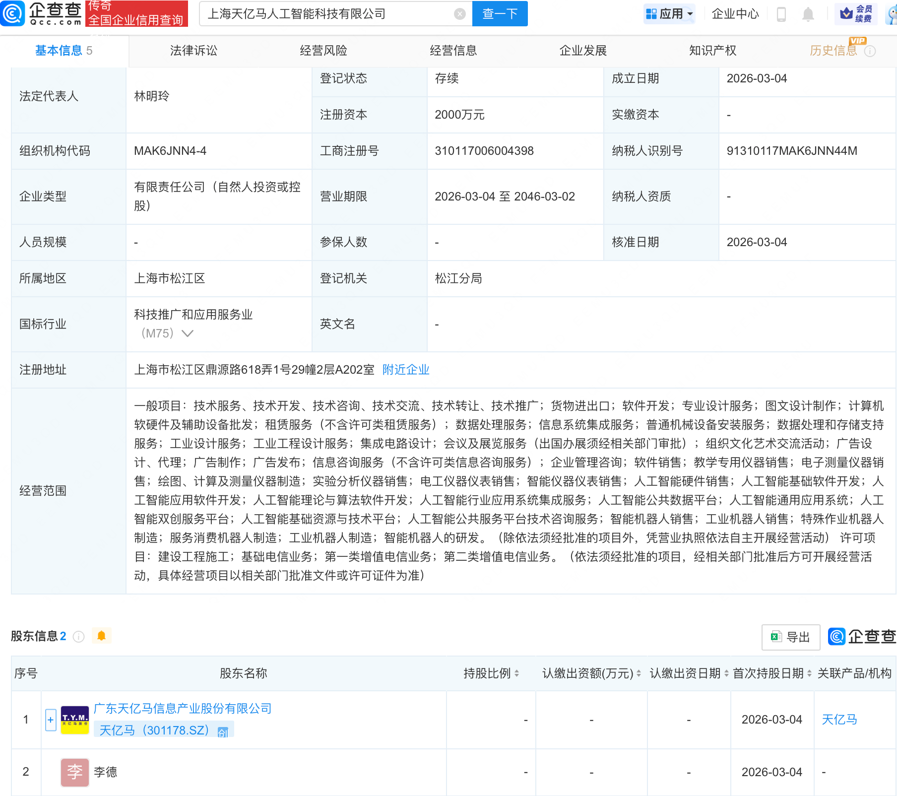 企查查APP显示,近日,上海天亿马人工智能科技有限公司成立,注册资本2000万元,经营范围包含:人工智能应用软件开发;人工智能理论与算法软件开发;人工智能行业应用系统集成服务;智能机器人销售等。企查查股权穿透显示,该公司由天亿马(301178.SZ)等共同持股。