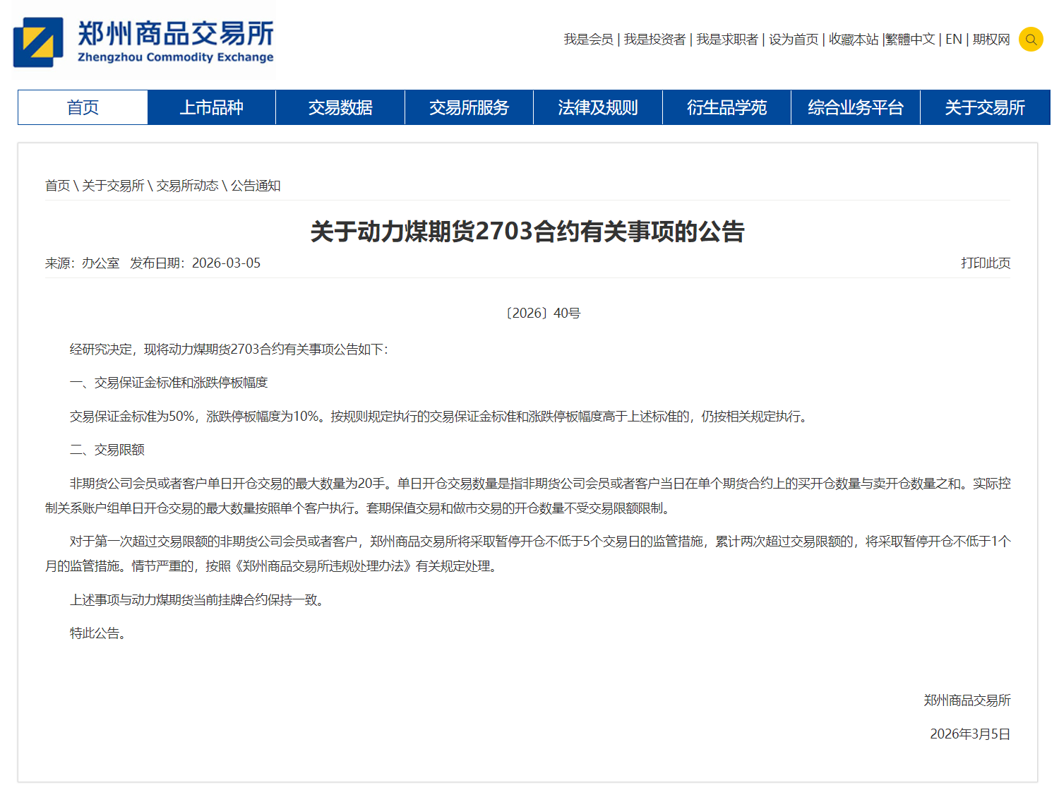 3月5日,郑商所发布公告,经研究决定,现将动力煤期货2703合约有关事项公告如下: