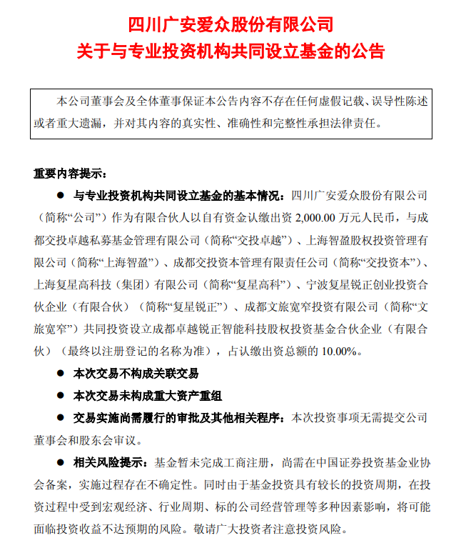 广安爱众出资2000万元参与设立投资基金,投资低空无人机、自动驾驶等领域