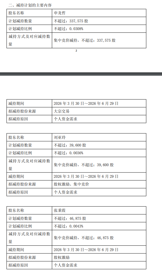 减持计划的主要内容:自本公告发布之日起 15 个交易日后3 个月内(窗口期等不得减持股份的时间除外),申龙哲先生本次拟通过集中竞价方式减持公司无限售流通股合计不超过 337,575 股,约占公司总股本的0.0308%;刘亚玲女士本次拟通过集中竞价方式减持公司无限售流通股合计不超过 39,600 股,约占公司总股本的 0.0036%;张秉霞女士本次拟通过集中竞价方式减持公司无限售流通股合计不超过46,875 股,约占公司总股本的 0.0043%。合计共42.41万股。