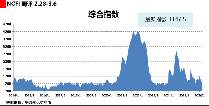 3月6日,据宁波航运交易所官微消息,本周,宁波航运交易所发布的海上丝绸之路指数(简称“海上丝路指数”)之宁波出口集装箱运价指数(NCFI)报收于1147.5点,较上周上涨16.1%。21条航线中有10条航线运价指数上涨,9条航线运价指数下跌,2条航线运价指数基本持平。“海上丝绸之路”沿线地区主要港口中,9个港口运价指数上涨,7个港口运价指数下跌。