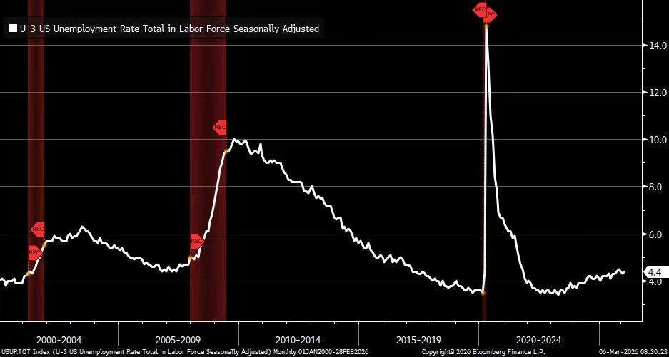 3月6日,美国公布数据显示,美国2月季调后非农就业人口减少9.2万人,继2025年10月之后再次录得负值,市场预期增加5.9万人。此外,美国2月份失业率为4.4%;预计为4.3%。
