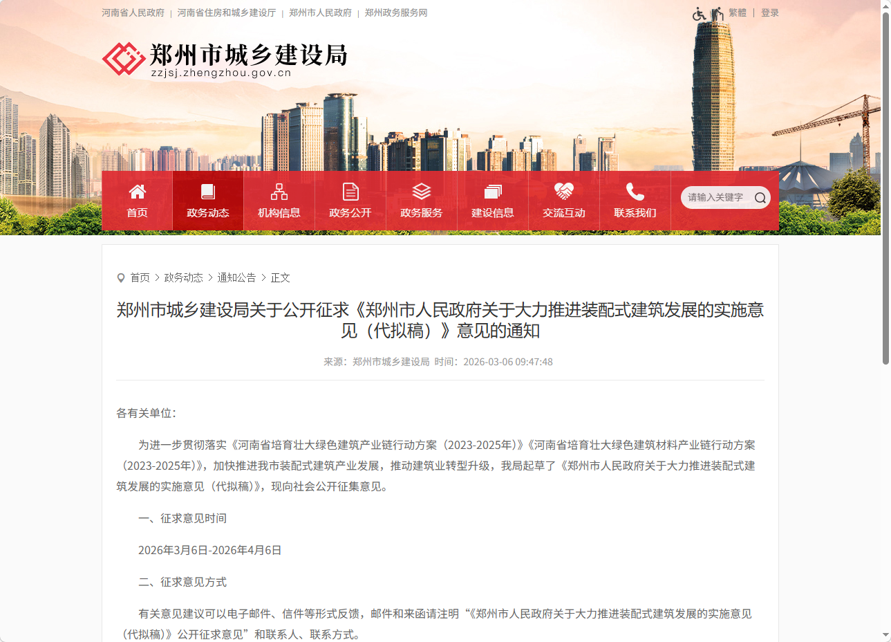 3月6日,郑州市城乡建设局发布关于公开征求《郑州市人民政府关于大力推进装配式建筑发展的实施意见(代拟稿)》意见的通知。