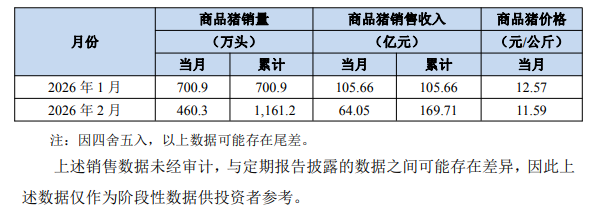 3月5日,牧原股份发布2026年2月份销售简报,2026年2月份,公司销售商品猪460.3万头,同比变动-0.77%;商品猪销售均价11.59元/公斤,同比变动-18.72%;商品猪销售收入64.05亿元,同比变动-23.98%。
