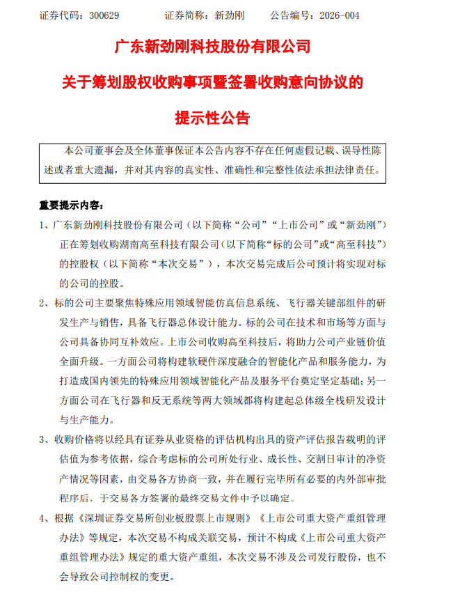 3月9日,新劲刚(300629.SZ)公告,公司正在筹划收购湖南高至科技有限公司(简称或“高至科技”)的控股权,本次交易完成后公司预计将实现对标的公司的控股。标的公司主要聚焦特殊应用领域智能仿真信息系统、飞行器关键部组件的研发生产与销售,具备飞行器总体设计能力。标的公司在技术和市场等方面与公司具备协同互补效应。