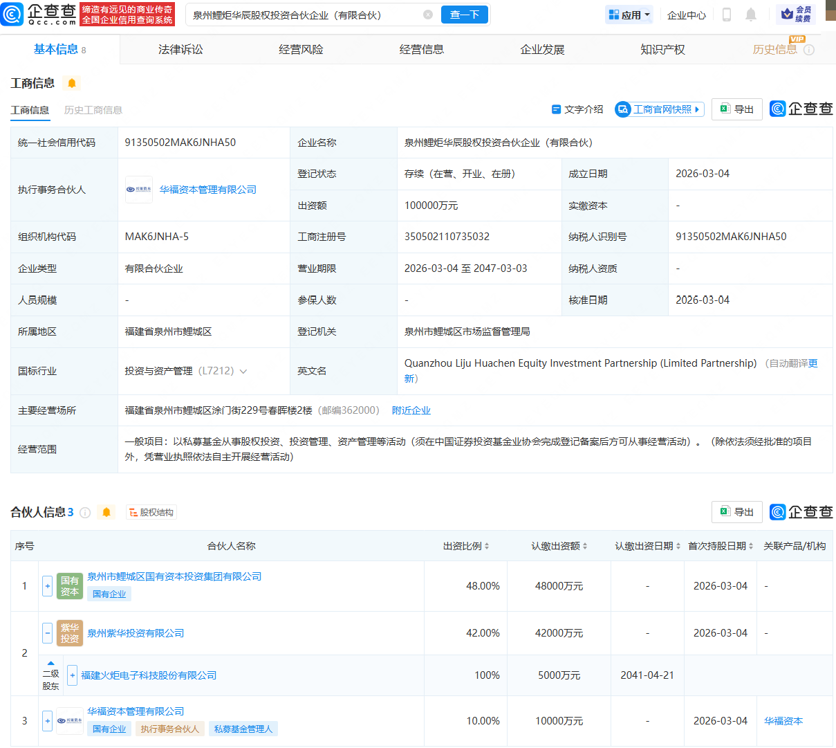 企查查APP显示,近日,泉州鲤炬华辰股权投资合伙企业(有限合伙)成立,出资额10亿元,经营范围包含:以私募基金从事股权投资、投资管理、资产管理等活动。企查查股权穿透显示,该合伙企业由泉州市鲤城区国有资本投资集团有限公司、火炬电子(603678.SH)全资子公司泉州紫华投资有限公司等共同持股。