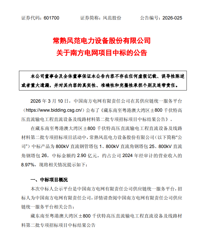 3月10日,风范股份(601700.SH)公告称,公司在藏东南至粤港澳大湾区±800千伏特高压直流输电工程直流设备及线路材料第二批专项招标项目中中标,中标产品包括800kV直流钢管塔包1、800kV直流角钢塔包25和26,中标金额约为2.90亿元,约占公司2024年经审计营业收入的8.97%。此次中标对公司经营业绩有积极影响,但不会改变公司业务的独立性。目前公司尚未签署正式合同,项目执行期限以签订的正式合同为准。