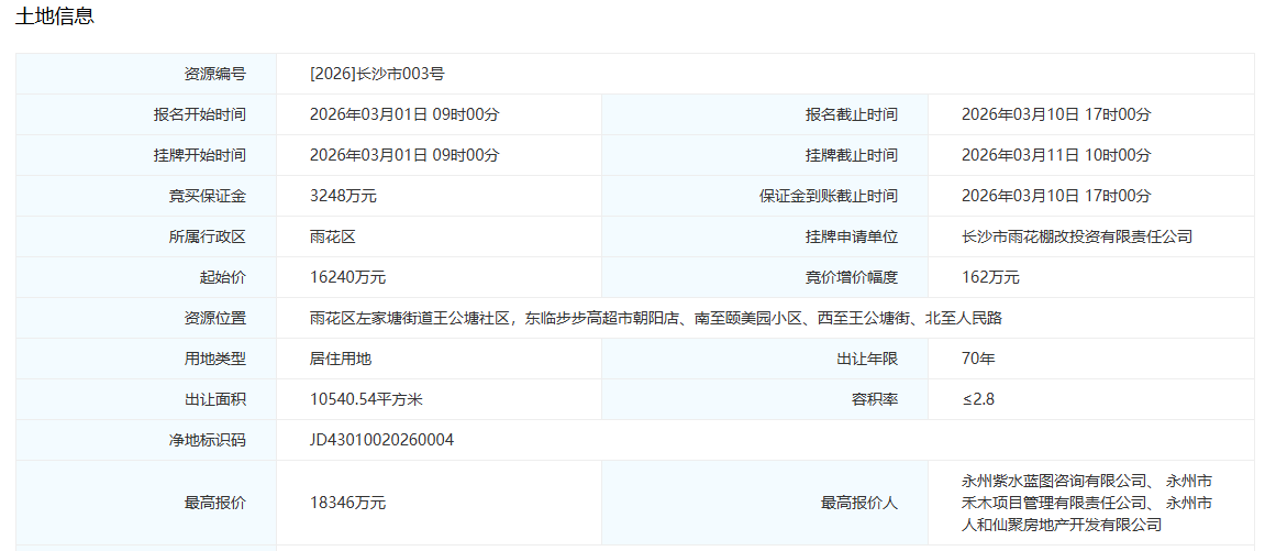 溢价率12.97% 永州民企联合体拿下长沙雨花区王公塘地块